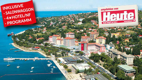 Sie besteigen heute Morgen Ihren Salonwaggon und fahren wie zu Kaiser´s Zeiten von Wien mit dem historischen Sonderzug über die Südstrecke nach Koper in Slowenien. Weitere Zusteige Möglichkeiten können wir in Wiener Neustadt und Graz anbieten. Koper ist eine slowenische Hafenstadt an der Adriaküste des Landes. Im Zentrum der mittelalterlichen Altstadt liegt der Tito-Platz (Titov Trg), an dem sich vom venezianischen Stil beeinflusste Sehenswürdigkeiten wie der Prätorenpalast und eine Loggia im gotischen Stil befinden. Der nahe gelegene Da-Ponte-Brunnen ist eine Nachbildung der berühmten Rialtobrücke in Venedig. Die etwa aus dem 12. Jahrhundert stammende Kathedrale Mariä Himmelfahrt besitzt einen hohen Glockenturm, der weite Blicke über die Bucht eröffnet. Nach Ankunft in Koper werden Sie vom Bahnhof abgeholt und mit dem Bus in den wunderschönen Ort Portoroz zu Ihrem Hotel gebracht. Check in und Zimmerbezug im Hotel. Der Rest des Tages steht Ihnen zur freien Verfügung! Erholen Sie sich von den vielen Eindrücken der Anreise, oder trinken Sie gemütlich einen Kaffee an der wunderschönen Promenade mit Blick auf´s Meer. Abendessen und Nächtigung im Hotel.